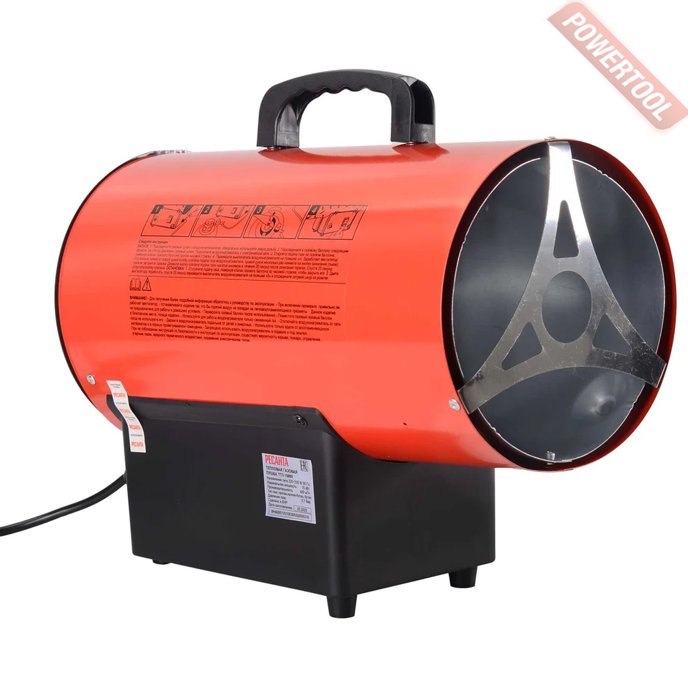 Газовая тепловая пушка РЕСАНТА ТГП-15000 - переносной обогреватель воздуха, работающий на газе, он быстро и эффективно обогревает большие площади. Это оборудование не требует больших затрат и капиталовложений. Газовые нагреватели воздуха широко применяются в помещениях с хорошей вентиляцией: на строительных площадках, заводах и в складских помещениях. Характерные особенности это полное использование топлива, а также обмен тепла благодаря непосредственному смешиванию входящего воздуха с продуктами сгорания. Что касается топлива, то для этих целей подходит баллон с пропаном или бутаном. Соответствующий шланг присоединяется через редуктор к вентилю баллона. Необходимо соблюдать все правила работы с газовыми баллонами. Также необходимо помнить, что процесс горения активно поглощает кислород, который жизненно необходим человеку. Поэтому помещения, где устанавливаются тепловые пушки, должны постоянно проветриваться и иметь хорошую вентиляцию. Для правильной работы обогреватель требует соответствующего количества свежего воздуха. Поэтому он предназначен для использования вне помещений или в помещениях с хорошей вентиляцией, где обеспечено соответствующее количество воздуха. Соответствующую вентиляцию можно обеспечить, приспосабливая обогревательную мощность прибора к площади помещения в соответствии со следующей пропорцией: 1 куб.м на каждые 100 Вт мощности. Ни в коем случае не рекомендуется, чтобы помещение было меньше, чем 100 куб.м. Соответствующий обмен воздуха может быть обеспечен благодаря вентиляционному отверстию, соответствующему следующим требованиям: величина 25 кв.см на 1 кВт обогревательной (минимум 250 кв.см) мощности, размещение точно между верхней и нижней частью помещения.