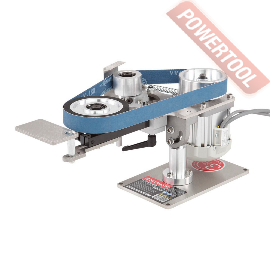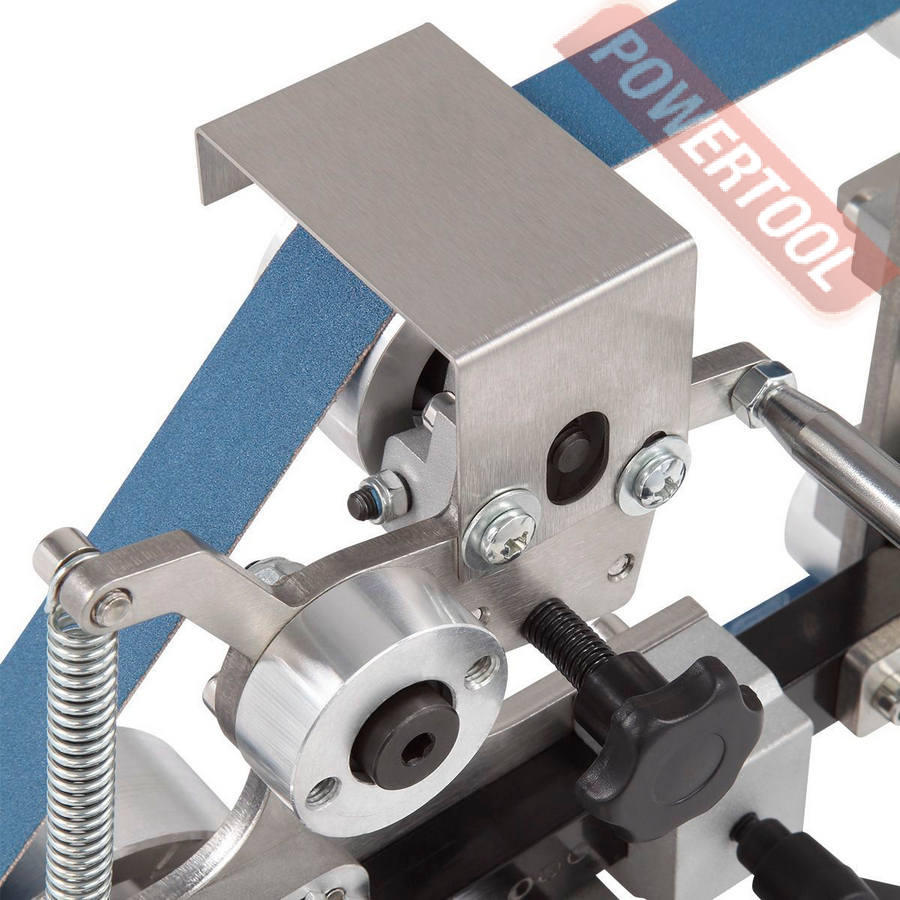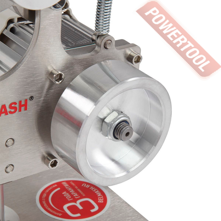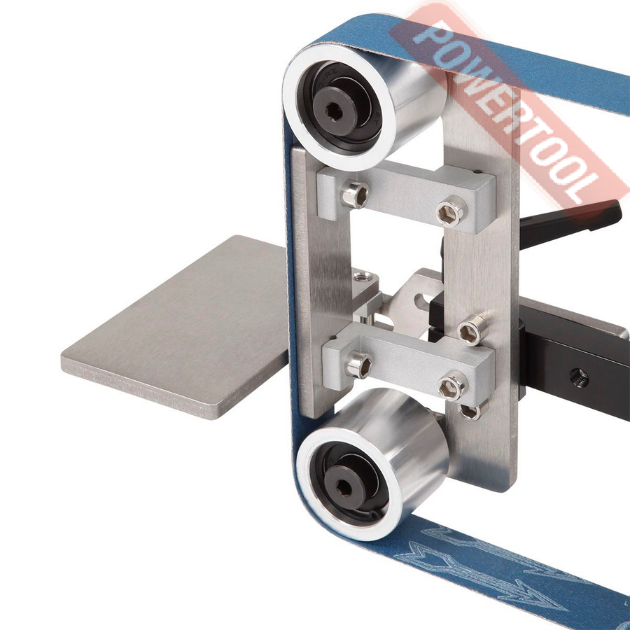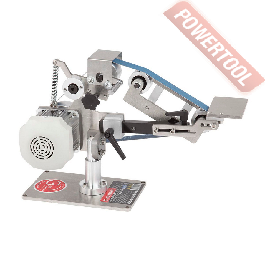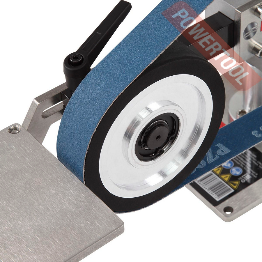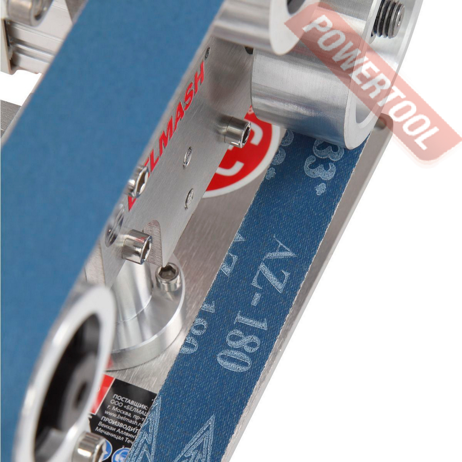 Используются шлифовальные ленты размером 762х25 мм с циркониевым электрокорундом. В комплект входят три ленты с зернистостью P100, P180 и P240 для грубой, промежуточной и финишной обработки. Поворотная консоль с роликами обеспечивает регулировку угла наклона от −15 до +20 градусов, а также возможность работы в вертикальном и горизонтальном положении с наклоном узла до 90 градусов. Контактный ролик диаметром 100 мм с резиновым покрытием обеспечивает плавный ход и стабильное натяжение ленты.