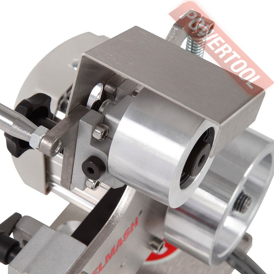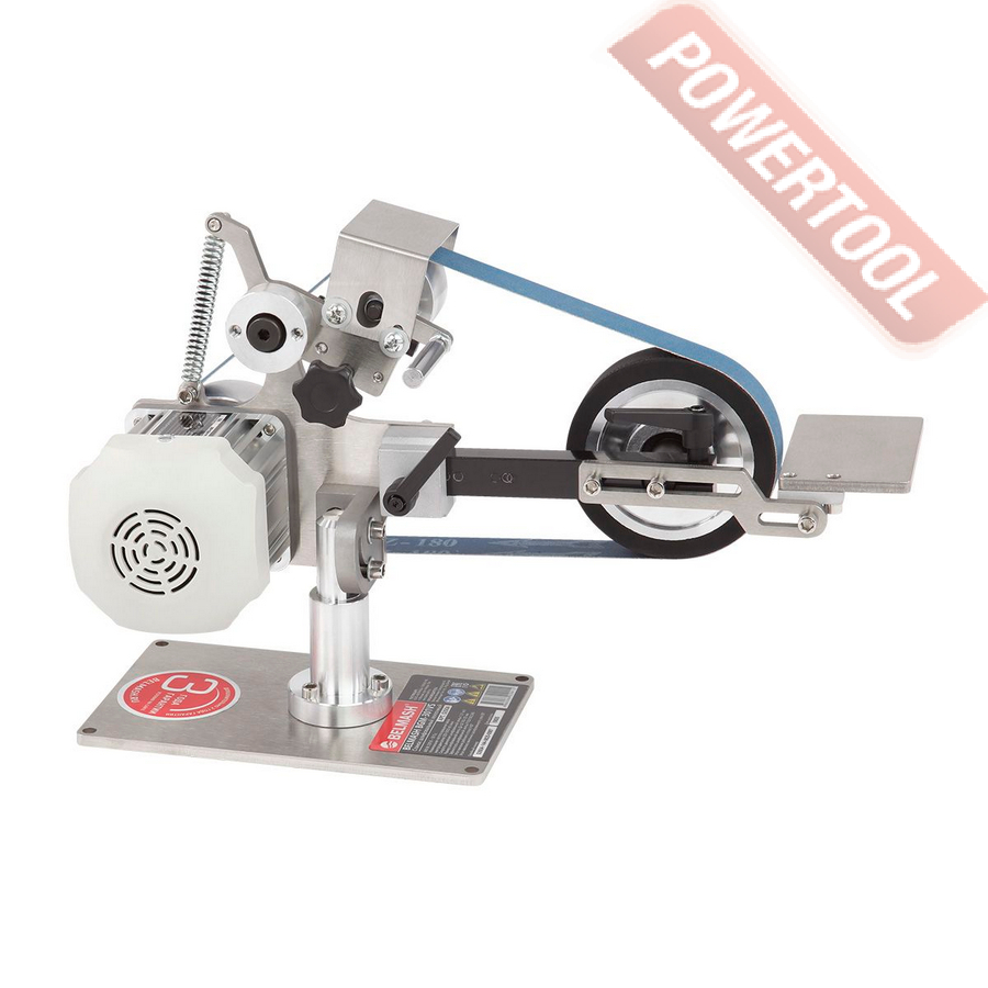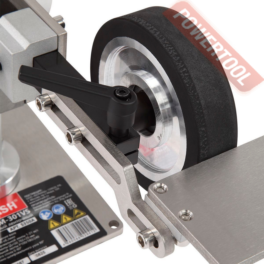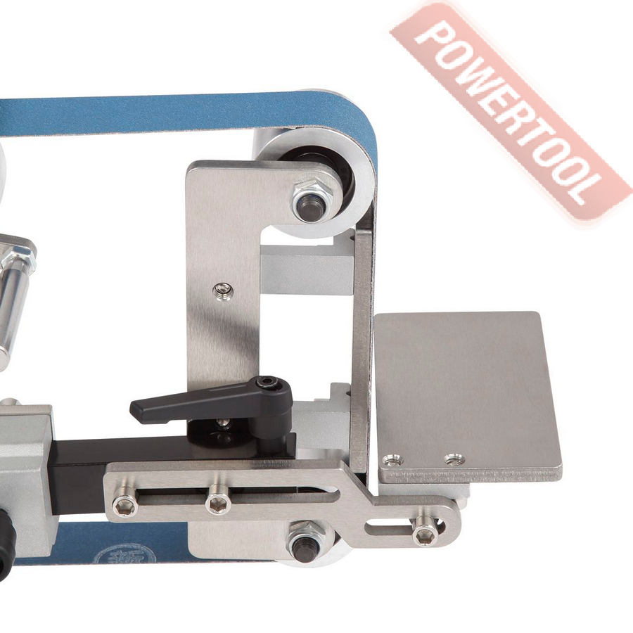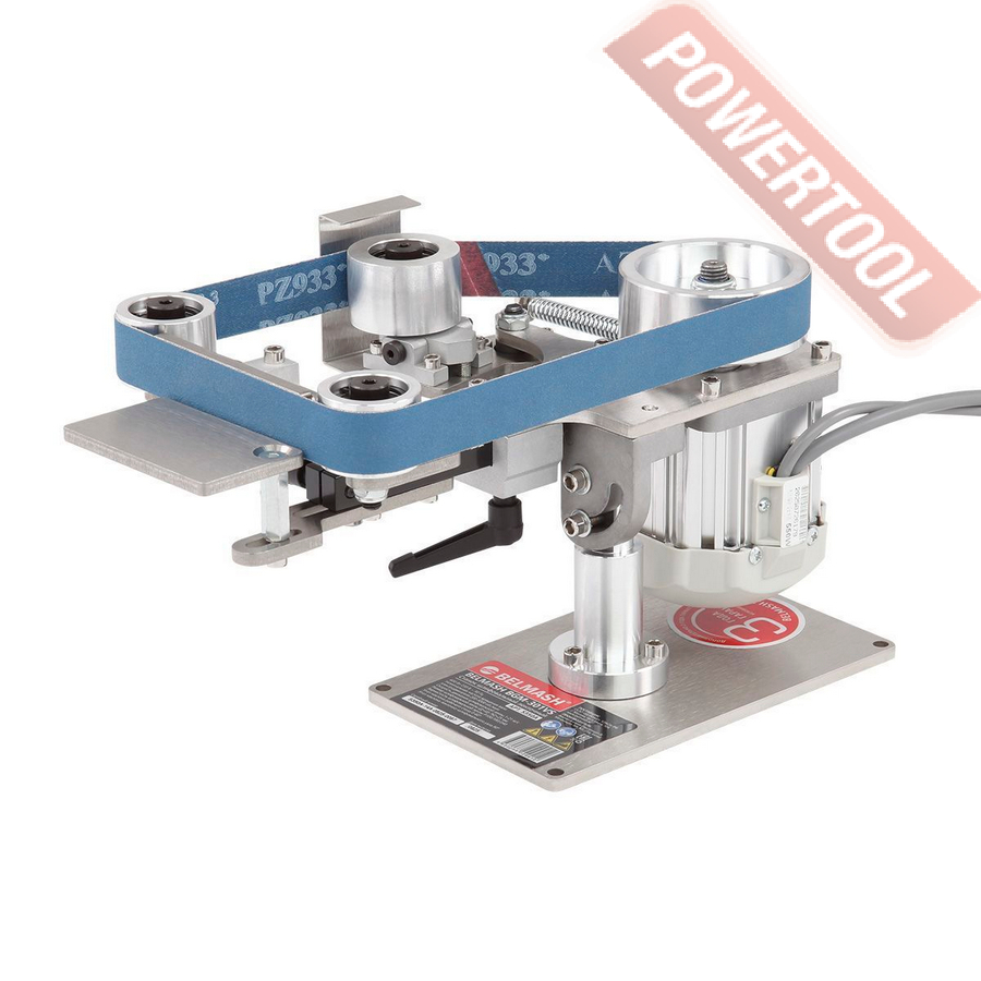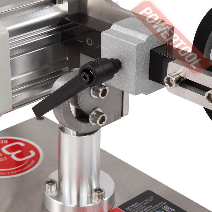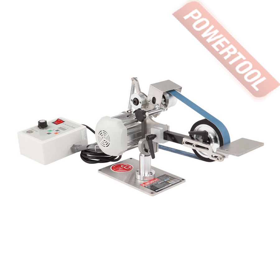 Используются шлифовальные ленты размером 762х25 мм с циркониевым электрокорундом. В комплект входят три ленты с зернистостью P100, P180 и P240 для грубой, промежуточной и финишной обработки. Поворотная консоль с роликами обеспечивает регулировку угла наклона от −15 до +20 градусов, а также возможность работы в вертикальном и горизонтальном положении с наклоном узла до 90 градусов. Контактный ролик диаметром 100 мм с резиновым покрытием обеспечивает плавный ход и стабильное натяжение ленты.