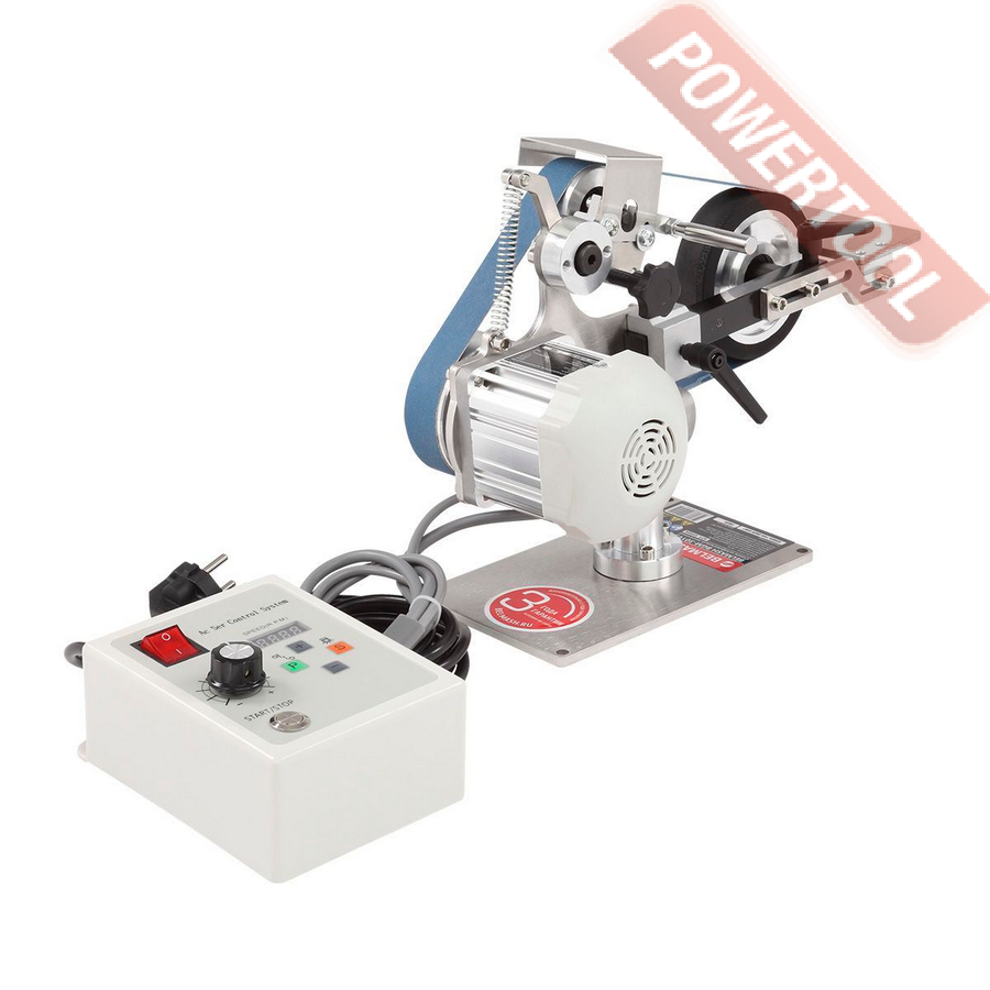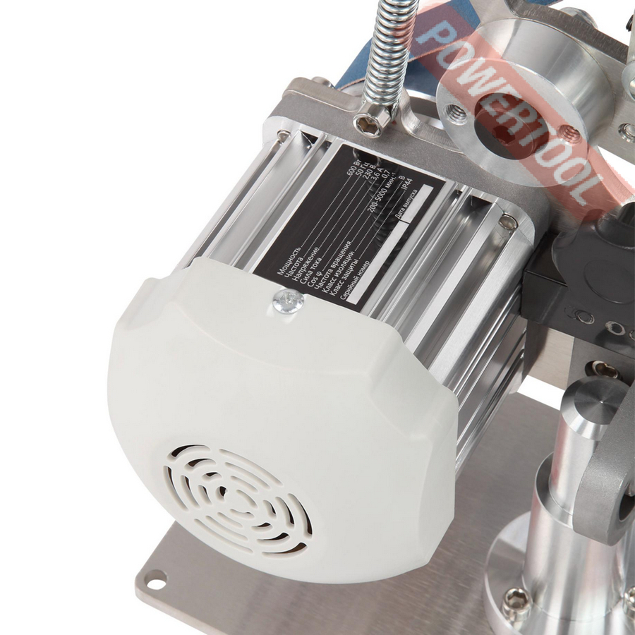 Станок оснащён бесщёточным синхронным BLDC-двигателем мощностью 600 Вт, рассчитанным на продолжительный режим работы S1. Прямой привод обеспечивает стабильную и эффективную передачу мощности. Частота вращения вала регулируется в диапазоне 200–5000 об/мин. Скорость движения шлифовальной ленты плавно регулируется от 1 до 21 м/с, что позволяет точно подобрать режим обработки под материал и задачу.