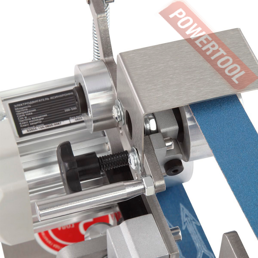 Конструкция станка допускает использование шлифовальных лент длиной от 675 до 850 мм в зависимости от конфигурации рабочего узла. Механизм натяжения и регулировки положения ленты обеспечивает быструю настройку и стабильную работу без смещения.