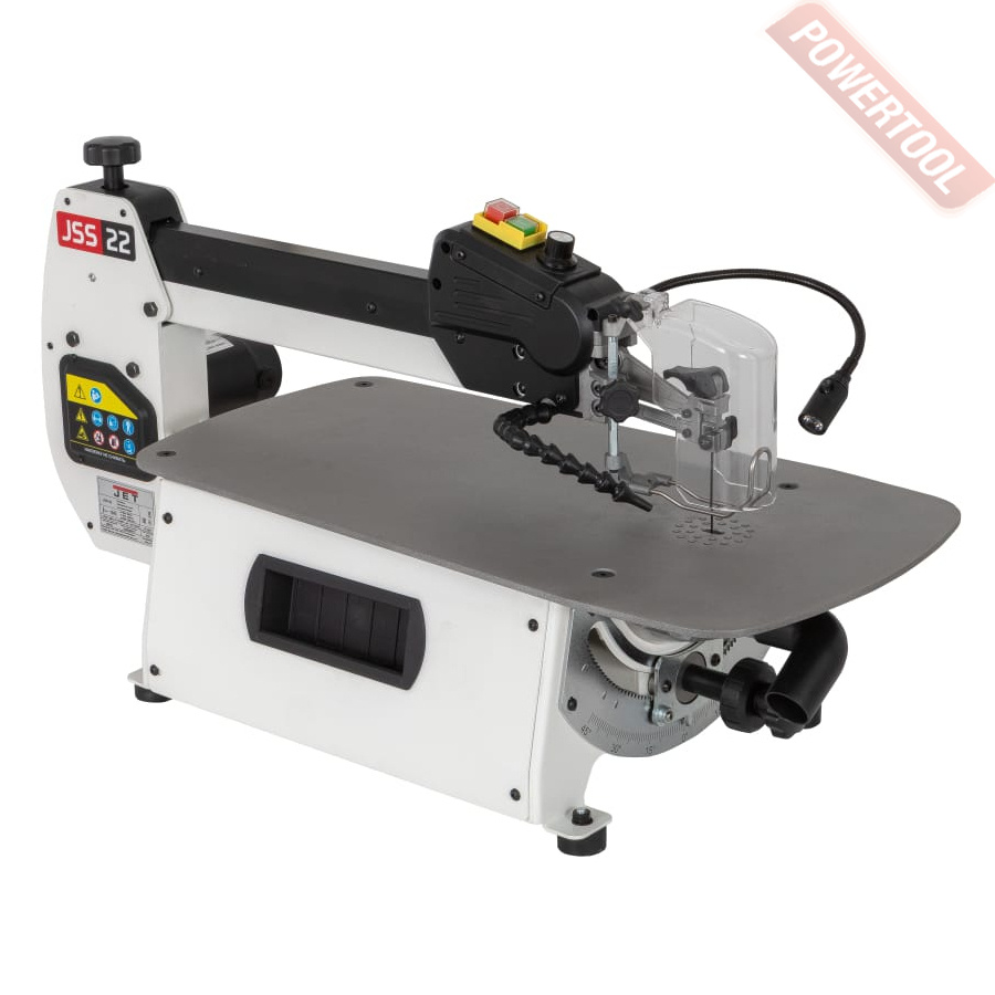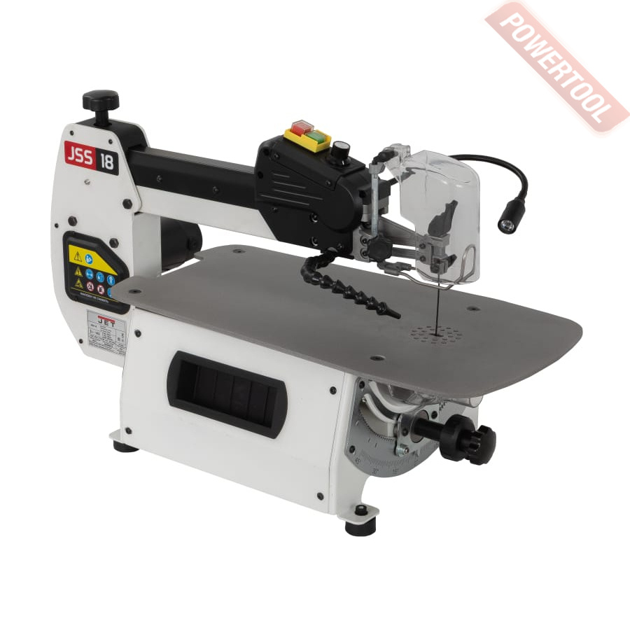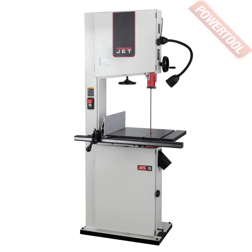 Ленточнопильный станок по дереву JET JWBS-10 - ленточная пила для любительской работы с деревом, имеет современную конструкцию, подобную более производительным профессиональным моделям Jet, и поставляется с полным набором необходимых в работе принадлежностей. Механизм натяжения пильной ленты оборудован индикатором силы и рычагом для быстрого ослабления перед хранением при его использовании настройки не сбиваются. Направляющие полотна трехроликовые с подшипниками качения, такой вариант считается наиболее долговечным, меньше всего изнашивает полотно, не приводит к его нагреву от трения. Двери корпуса пилы зафиксированы винтами с барашковой рукояткой, что обеспечивает доступ к механизму для его наладки и надежное запирание без использования вспомогательного инструмента вроде отверток или гаечных ключей. Станок укомплектован упорами заготовки: угловым скользящим вдоль Т-образного паза и параллельным. Последний установлен на направляющем профиле и имеет двухстороннюю эксцентриковую фиксацию – наиболее удобный, точный и жесткий вариант зажима. Для удобства настройки положения предусмотрена планка с миллиметровой разметкой и лупа на кронштейне для чтения показаний. На корпусе закреплен гибкий штатив со светодиодным фонариком подсветки рабочей области. Сборная напольная подставка также поставляется стандартно.