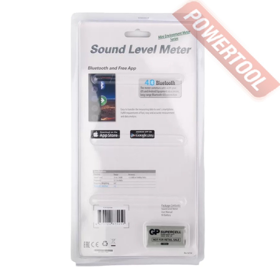 Шумомер цифровой, внесен в госреестр СИ РФ, 3 класс точности, диапазон измерения уровня шума 35-130 дБ, частотный диапазон 31,5-8000 Гц, погрешность измерения уровня шума 3,5 дБ, шаг измерения уровня шума 0,1 дБ, микрофон 1/2 дюйма, A/C-взвешивание, быстрое/медленное время взвешивания 0,125/1 сек, 4-разрядный ЖК-дисплей, регистрация max/min значений, фиксация результатов HOLD, Bluetooth, питание от 1 батарейки 9В тип Крона, автоотключение через 10 мин, габариты ДхШхВ 185х54х36 мм, вес 0,184 кг, элементы питания.