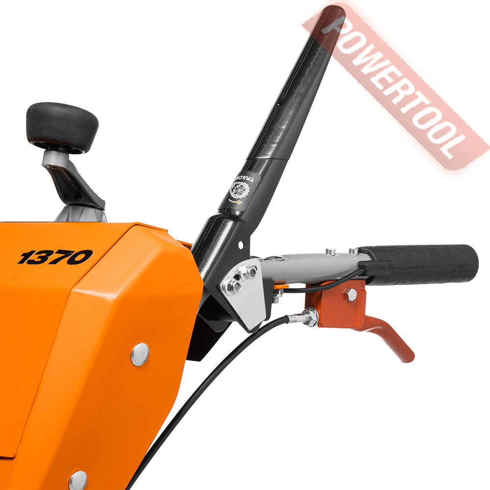 - Взаимная блокировка рукояток. Нажатие 2-х рукояток приводит к их взаимной блокировке. Это позволяет управлять снегоуборщиком даже одной рукой, в том числе изменять направление выброса снега без остановки работы.