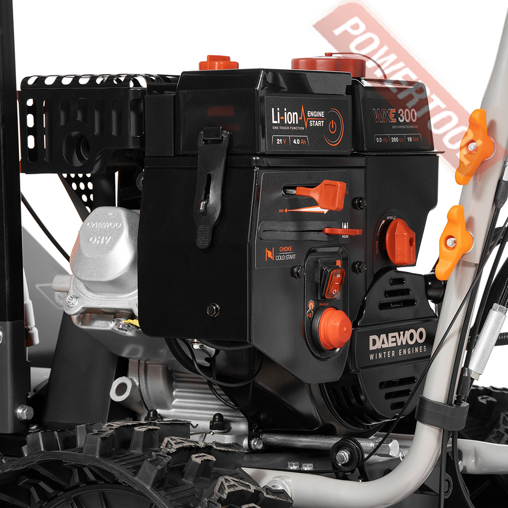 - Двигатель DAEWOO зимней серии WXE 300. Уверенный запуск при отрицательных температурах. Электрозапуск от съемной батареи 21В. Повышенный моторный ресурс. Увеличенный глушитель и сниженный уровень шума.
