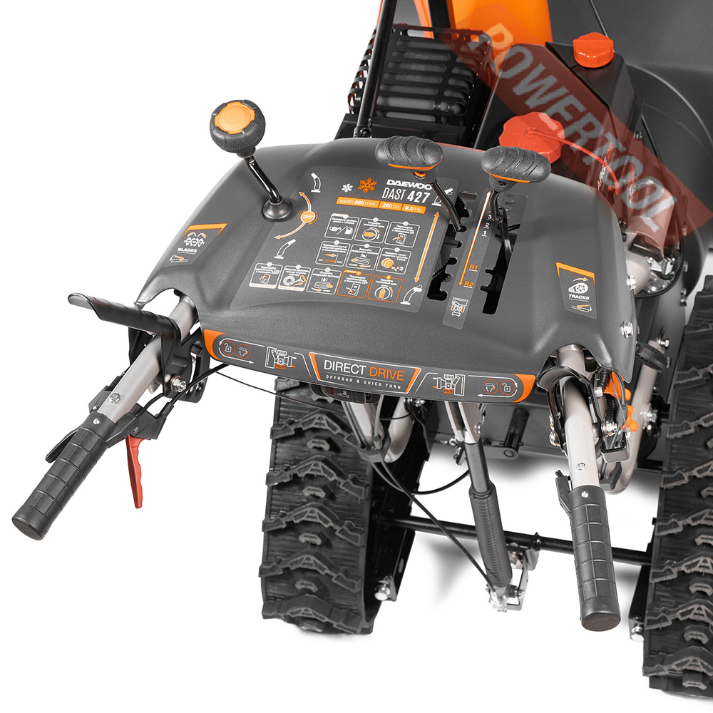- Панель управления с системой изменения скорости передвижения, направления и дальности выброса снега обеспечивает комфортное управление и работу со снегоуборщиком.