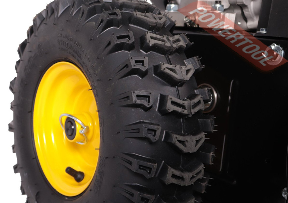 - Маневренность. 14-дюймовые пневматические колеса с глубоким агрессивным протектором не дают снегу налипать и обеспечивают уверенное сцепление даже на обледеневшем покрытии, мягко амортизируют движение на кочках и не проваливаются в снег, показывая отличную проходимость. Функция отключения привода одного колеса позволяет осуществить поворот снегоуборщика на 180 градусов, что облегчает его маневренность.