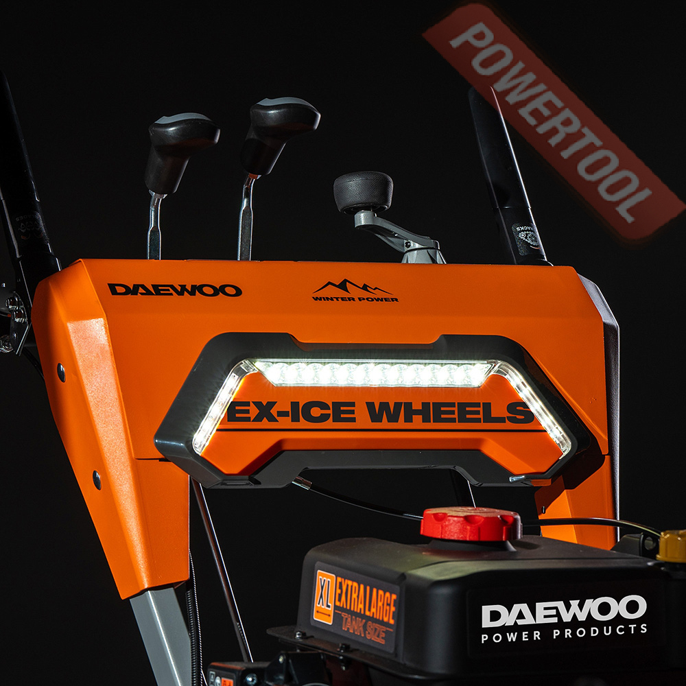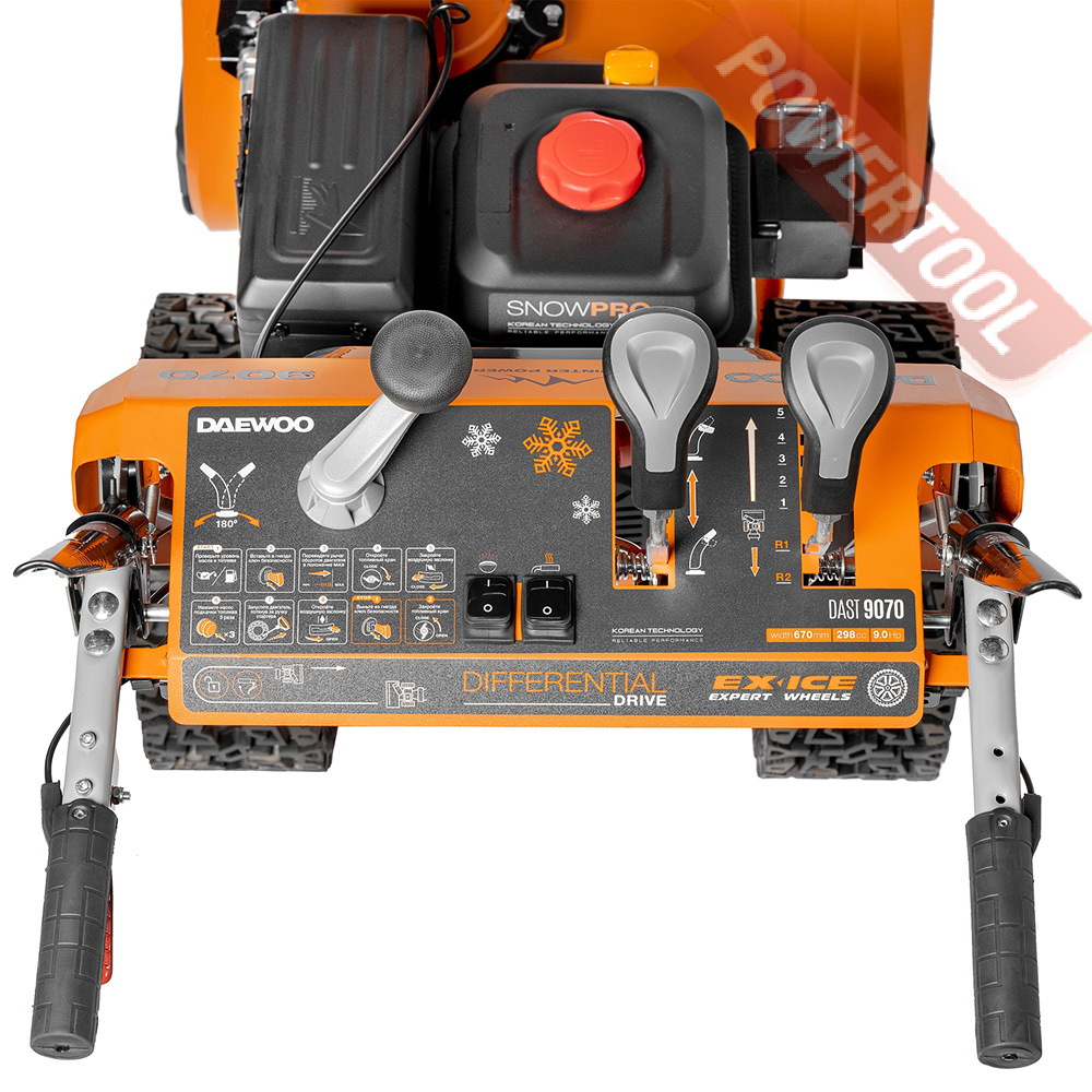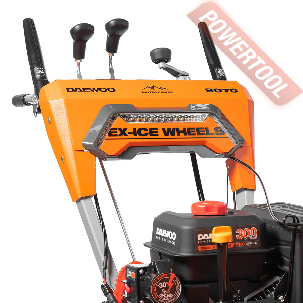 Снегоуборщик колесный самоходный, ширина ковша 67 см, высота ковша 55 см, скорости 5 вперед и 2 назад, выбор направления и дальности выброса снега рукоятками с панели оператора, угол поворота желоба 180 градусов, дальность выброса достигает до 15 м, материал желоба сталь, управление одной рукой, разблокировка дифференциала курком под одной из рукояток, подогрев рукояток, двухсоставные направляющие лыжи, LED фара, защита от ржавчины ZN+, колеса EX-ICE 150/25-R8, 4-тактный бензиновый двигатель DAEWOO 300 winter объемом 298 куб.см и мощностью 9 л.с., электростартер от сети 220 В, топливный бак 3,5 л, объем картера 0,6 л, размеры упаковки 1130х760х835 мм, вес 112 кг.