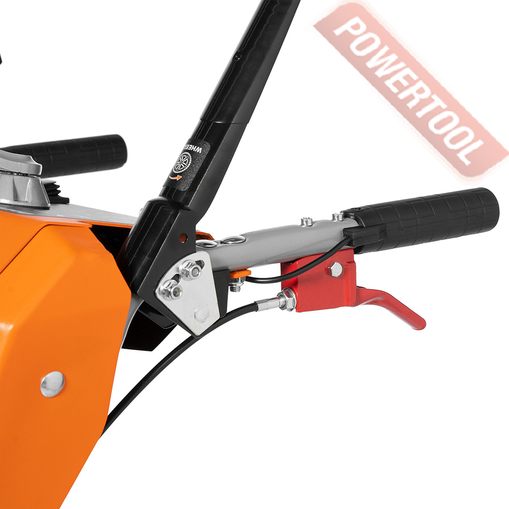• Взаимная блокировка рукояток. При зажатии обеих рукояток происходит их взаимная блокировка. Это позволяет управлять снегоуборщиком даже одной рукой, в том числе изменять направление выброса снега без остановки работы.
