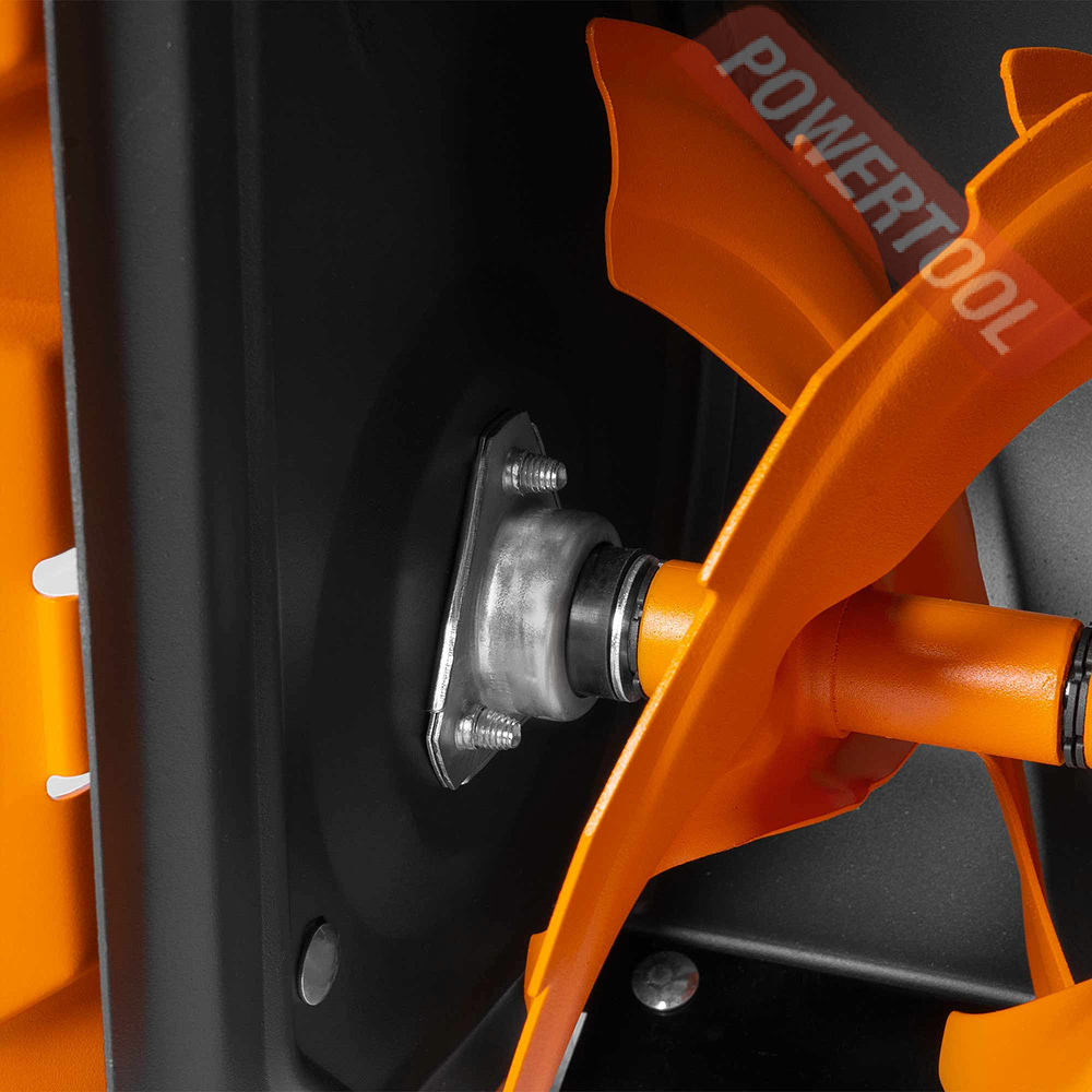 - Усиленный редуктор с двумя дополнительными опорами передает до 95 процентов крутящего момента двигателя. Срезные болты на шнеках защищают редуктор от перегрузок. Выходной вал редуктора крепится на подшипниках большого диаметра, что обеспечивает высокую устойчивость механизмов к вибрации и ударам.