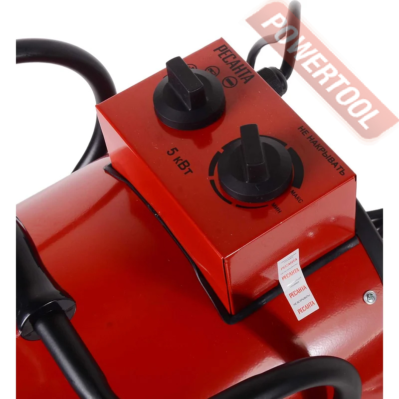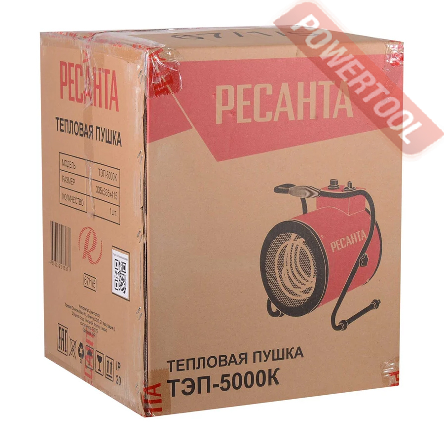 Тепловая пушка электрическая РЕСАНТА ТЭП-5000К - надежный экономичный обогреватель для квартиры и загородного дома. Большая площадь ТЭНов из нержавеющей стали и эффективный обдув способствуют более быстрому нагреву помещения без выжигания кислорода. Безопасность обеспечена дополнительным защитным кожухом, термопредохранителем, капиллярным терморегулятором и заземлением корпуса. Это устройство позволяет создать приемлемые климатические условия в помещениях даже с полным отсутствием иных источников отопления. Конструкция надежна и практична. Запуск производится путем переключения регулировочного реле. Обеспечивает чистый, быстрый и безопасный нагрев, идеален в качестве временного или экстренного средства обогрева благодаря простоте эксплуатации и мобильности. Процесс эксплуатации можно охарактеризовать достаточно тихим, при этом отсутствуют какие либо запахи. Нет необходимости заправлять оборудование топливом, достаточно просто произвести подсоединение к сети. Также однозначным достоинством технологии является сбережение кислорода внутри помещения.