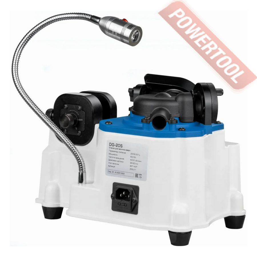Заточной станок для заточки сверл, мощность 160 Вт, напряжение 220 В, число оборотов 6000 об/мин, диаметр затачиваемых сверл 2-20 мм, подсветка рабочей зоны, угол заточки сверла 90-140 градусов, вес 9,5 кг, заточной диск CBN230, цанговый патрон ER20, цанговый патрон ER25, комплект цанг ER20 2-13 мм 11 шт, комплект цанг ER25 13-20 мм 7 шт, набор шестигранников, деревянный кейс для хранения инструмента.