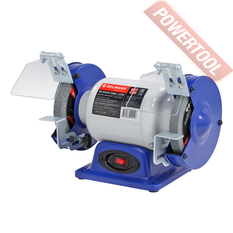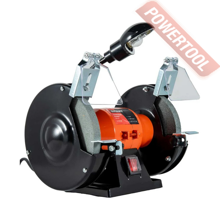 Заточной станок универсальный с двумя кругами, мощность 200 Вт, напряжение 220 В, шлифкруг 150х12,7х16 мм, число оборотов 2950 об/мин, защитных экран, подсветка рабочей зоны, вес 4,5 кг, шлифовальный круг 150х12,7х16 мм 2 шт.